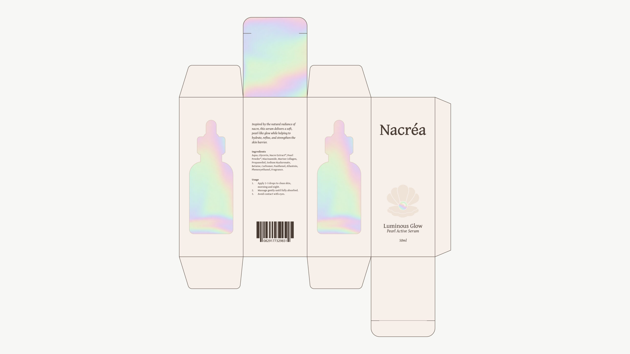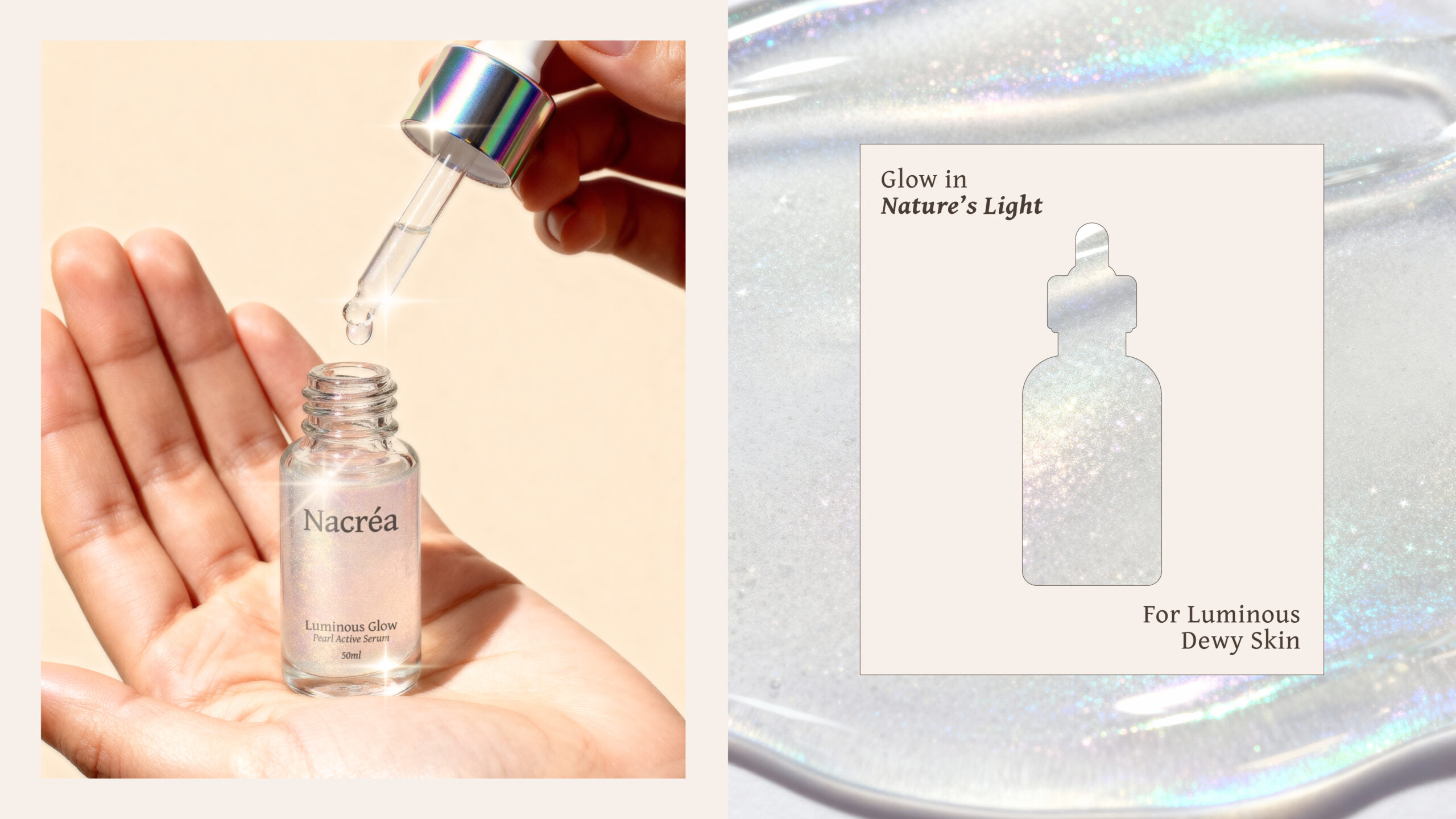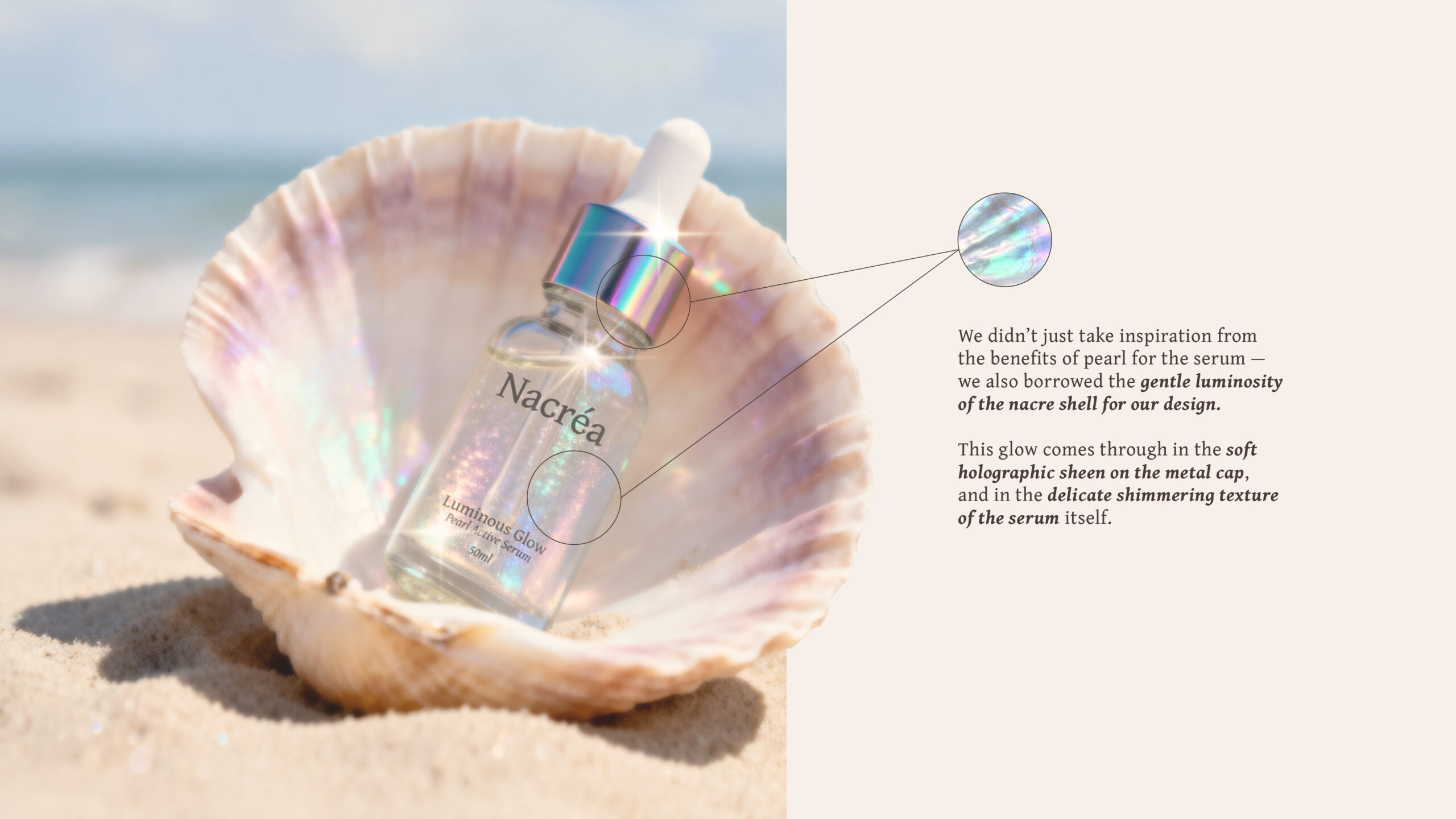 The packaging design mirrors that beauty through soft serif transitions, subtle shimmering textures, and a holographic highlight that brings the pearl’s aura to life.